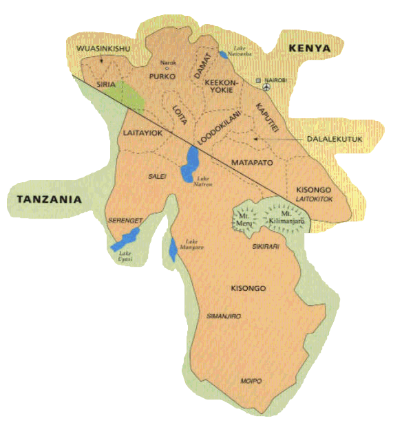 Der Nordteil ihres Landes wurde von den europäischen Siedlern durch unrühmliche Verträge (1904 & 1911) mit der britischen Kolonialleitung übernommen. Durch dieses Abkommen wurden die Maasai gezwungen, erst das fruchtbare Gebiet von Nakuru/Naivasha und anschließend das Laikipia-Plateau und Kinangop weißen Siedlern zu überlassen. Bei der Unabhängigkeitserklärung 1963 wurden diese Gebiete nicht an die Maasai zurückgegeben, sondern statt dessen in kleine landwirtschaftliche Parzellen aufgeteilt und an die Kikuyu verkauft. Weiteres Land ging den Maasai verloren, als das Maasai-Mara-Wildreservat und der Amboseli- und der Tsavo-Nationalpark gegründet wurden — hierfür wurden Gebiete aus dem südlichen Maasai-Reservat annektiert, ohne Rücksprache oder Entschädigung an den Stämmen. Dieser Landraub setzt sich bis heute fort, mit einer hinterlistigen Politik landwirtschaftlicher Genossenschaften, mittels derer die Maasai »geteilt und besiegt« werden. Exzessive Bewirtschaftung von Seiten der Landwirte hat große Gebiete des Maasai-Landes ausgelaugt, die ehemals in der Trockenzeit als Weideland und notwendige Wasserreservoirs gedient haben. Als Folge heute werden sie zu einem viel kleineren Bereich Kajiado und Narok in den Bezirken von Kenia, und Kiteto, Ngorongoro und Simanjiro zu den Bezirken der Arusha Region in Tanzania begrenzt Sie verloren zwei Drittel ihrer Weideflächen und wurden in die Reservate Südkenia und Nordtansania zurückgedrängt.  | Gesellschaftsgruppen im MaasailandDie Maasai wohnen entlang an der großen Rift-Senke in den halbariden und trockenen Ländern. Die Maasai nehmen einen Gesamtlandbereich von 160.000 km²in Ostafrika ein. Dort leben ungefähr eine 1/2 Million Maasai. Jedoch beteiligen sich nicht alle Maasai an der nationalen Zählung der Regierung, und dadurch kann man hier nur von Schätzwerten reden. Im Maasailand unterteilen sich die Maasai in verschiedene Gesellschaftsgruppen. Man unterteilt sie in 16. Abschnitten, die man Iloshon nennt. Jeder spezifische Abschnitt (Oloshon) hat ihre eigene Politik und pflegt ihre eigene Kultur. Z.B. findet man den Kisongo Abschnitt hauptsächlich in den südlichen Bezirken, die Arusha Region in Tanzania und im Loita im Narok Bezirk. Jedoch alle dort lebenden Maasai sprechen ihre Standardsprache, Maa Die Iloshon Le Maa (Abschnitte, Sektionen bzw. Bezirke der Maasais)